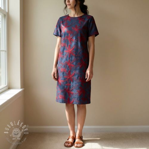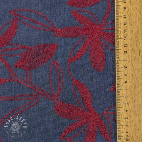Bavlnená látka JEANS Embroidery Flowers burgundy