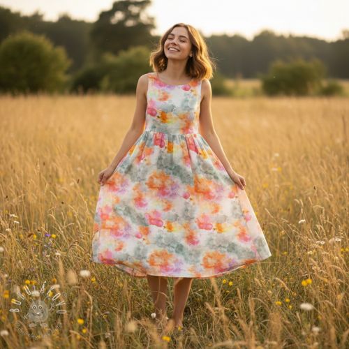 Ľan s bavlnou Abstract flowers RAMIE orange digital print