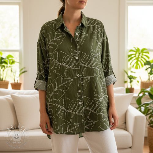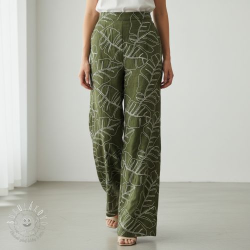 Viskóza s ľanom EMBROIDERY Leaves forest green